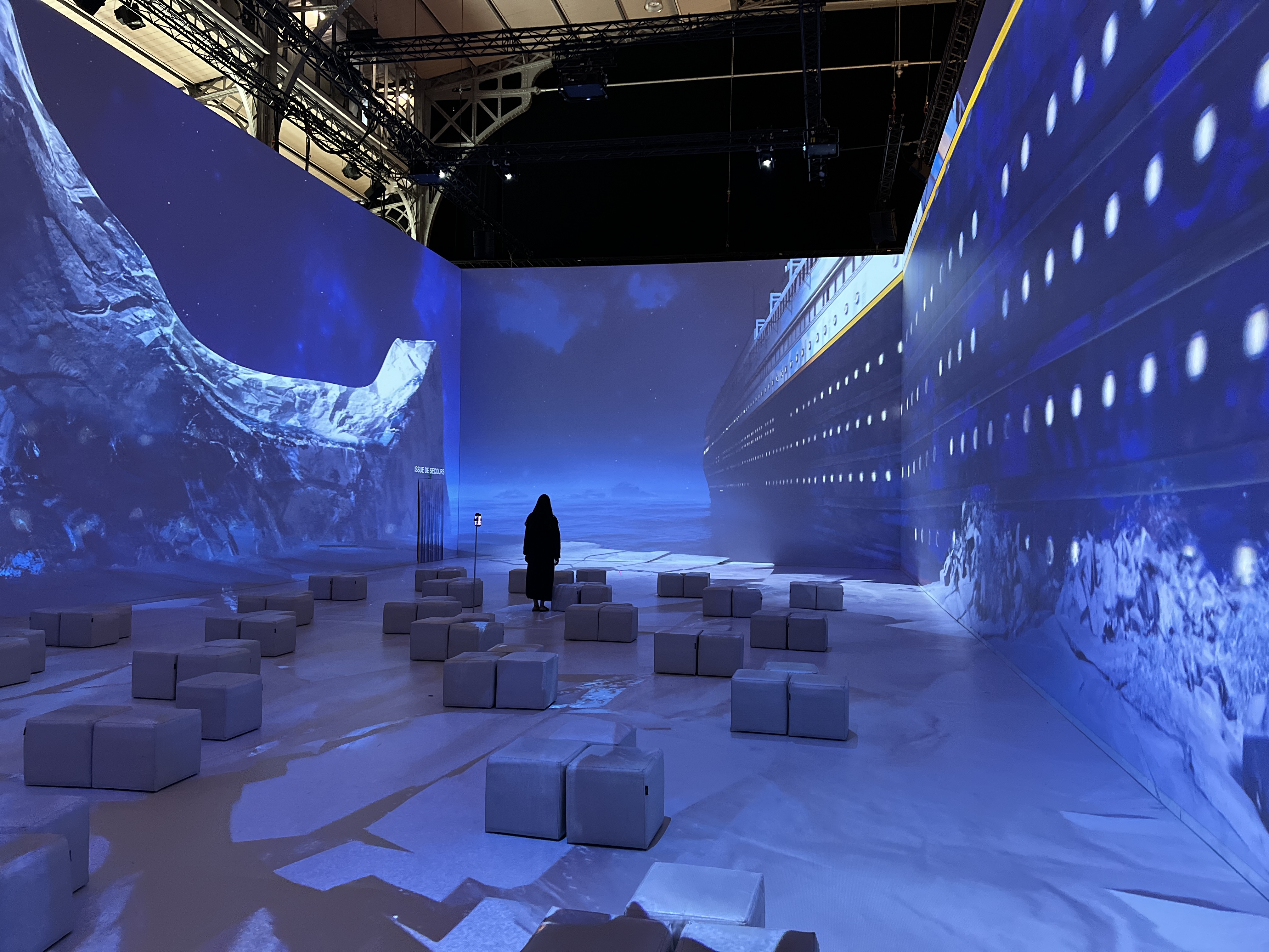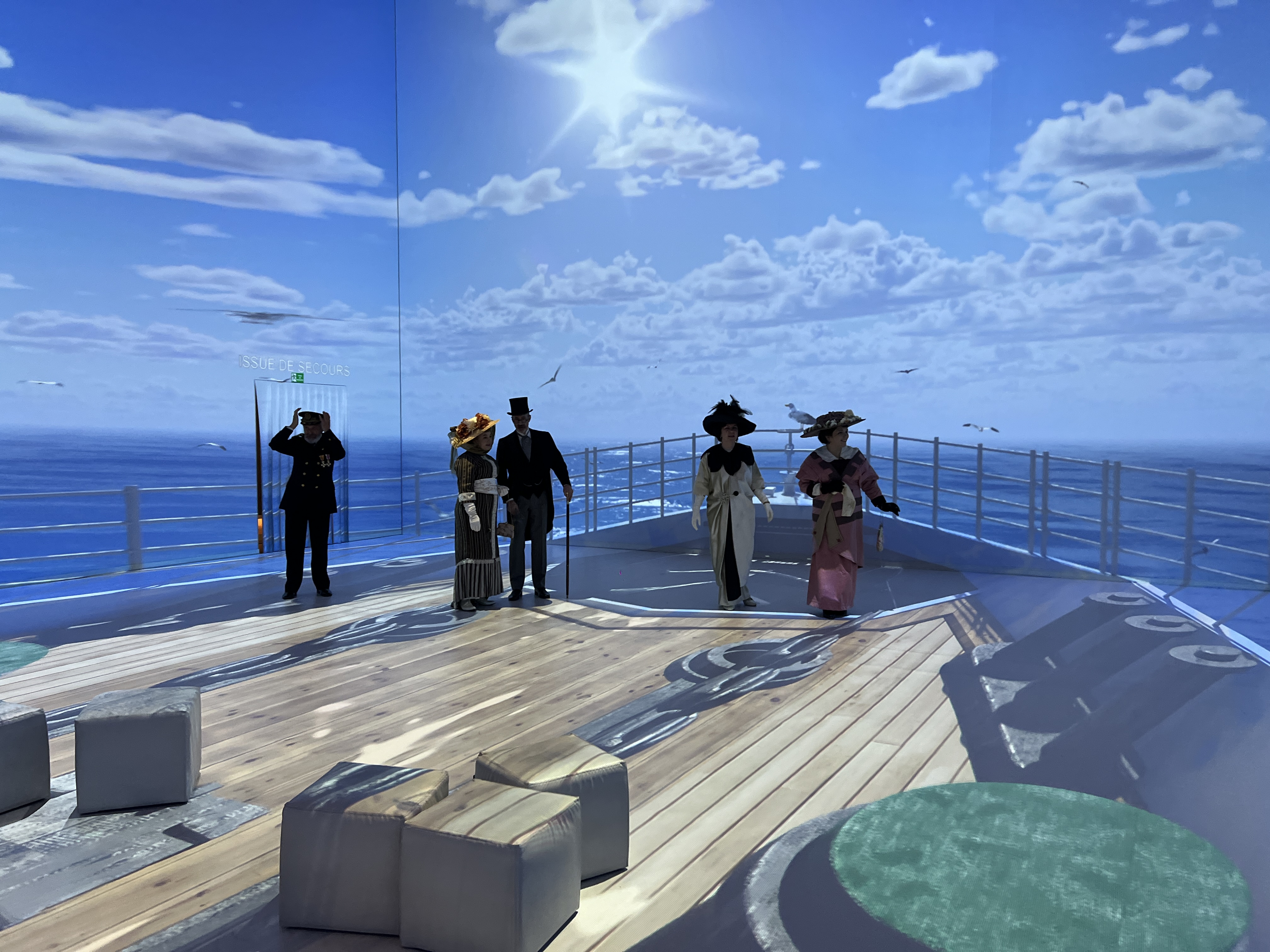 Puis le parcours bascule dans l’un de ses moments les plus saisissants : une salle de réalité virtuelle rend hommage à l’orchestre du Titanic. Casque sur la tête, la musique devient l’ultime repère, portée par une composition originale inspirée du dernier morceau joué à bord. La traversée se prolonge dans un vaste espace de projections à 360°, sur plus de 1 200 m², du sol au plafond. Les images enveloppent, retracent la construction du navire, la traversée, puis le naufrage. Le récit s’ancre dans l’histoire d’une famille fictive, fil narratif discret au cœur du drame, jusqu’à l’engloutissement final.